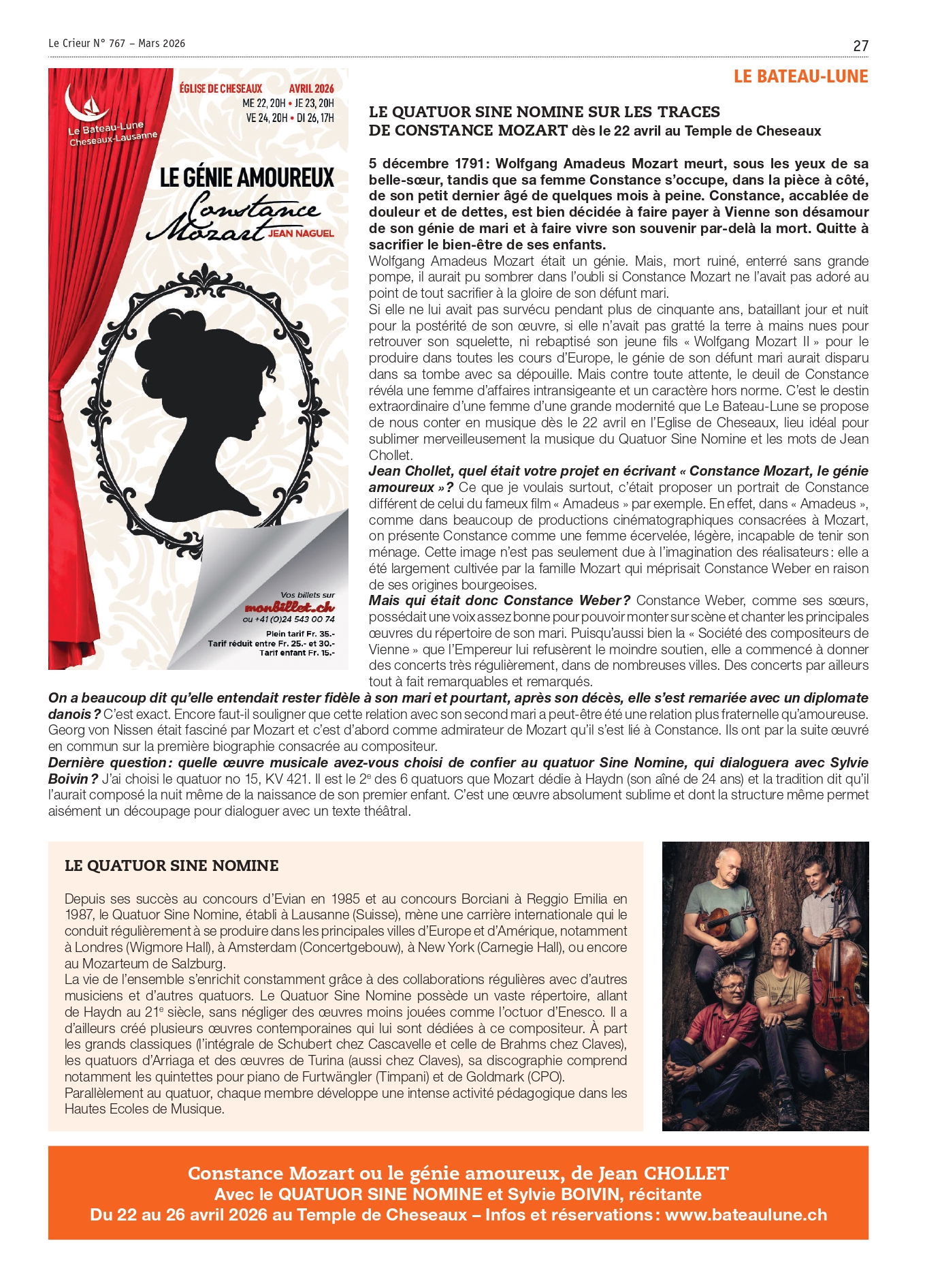 CONSTANCE MOZART OU LE GÉNIE AMOUREUX du 22 au 26 avril 2026 THÉÂTRE | MUSIQUE CLASSIQUE 5 décembre 1791 : Wolfgang Amadeus Mozart meurt, sous les yeux de sa belle-sœur, tandis que sa femme Constance s’occupe, dans la pièce à côté, de son petit dernier âgé de quelques...